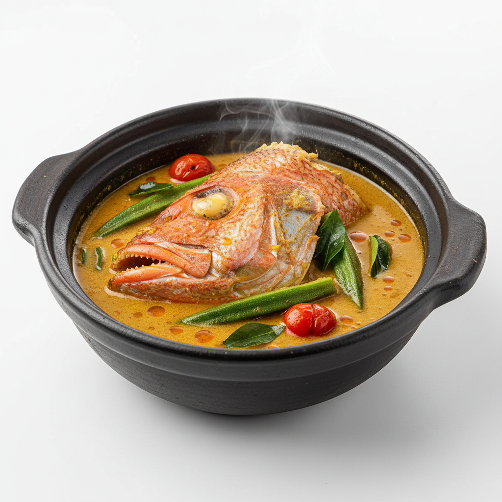 Nikmati mahakarya kuliner Nusantara yang menghadirkan Kepala Ikan Kakap Merah premium, dimasak perlahan dalam kuah gulai kental berwarna kuning keemasan yang kaya akan rempah-rempah pilihan. Disajikan secara elegan dalam periuk tanah liat tradisional, hidangan ini menonjolkan tekstur daging ikan yang lembut dan juicy, berpadu harmonis dengan kesegaran okra hijau, tomat ceri yang merekah, serta aroma daun kari yang segar. Kilauan minyak rempah di atas permukaan saus yang gurih memberikan dimensi rasa yang mendalam, menciptakan pengalaman bersantap mewah yang memanjakan seluruh indera Anda.