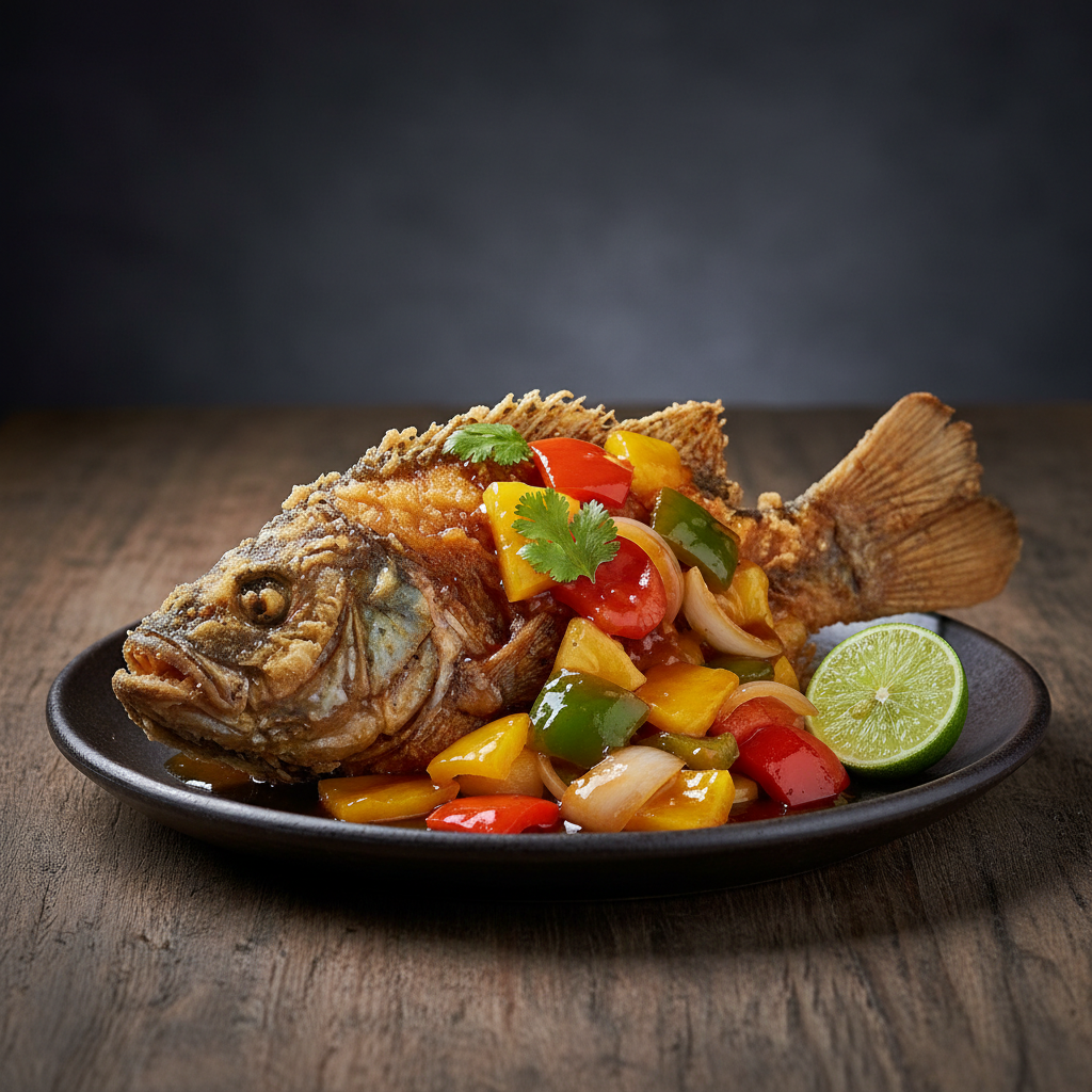 Ikan gurame pilihan yang digoreng hingga mencapai tingkat keemasan sempurna, menghadirkan tekstur kulit yang sangat renyah namun tetap menjaga kelembutan daging putih di dalamnya. Disiram dengan saus asam manis autentik yang diracik dari sari tomat segar, nanas madu yang manis, serta potongan paprika warna-warni, hidangan ini menawarkan ledakan rasa yang segar, kaya, dan tak terlupakan di setiap suapan.