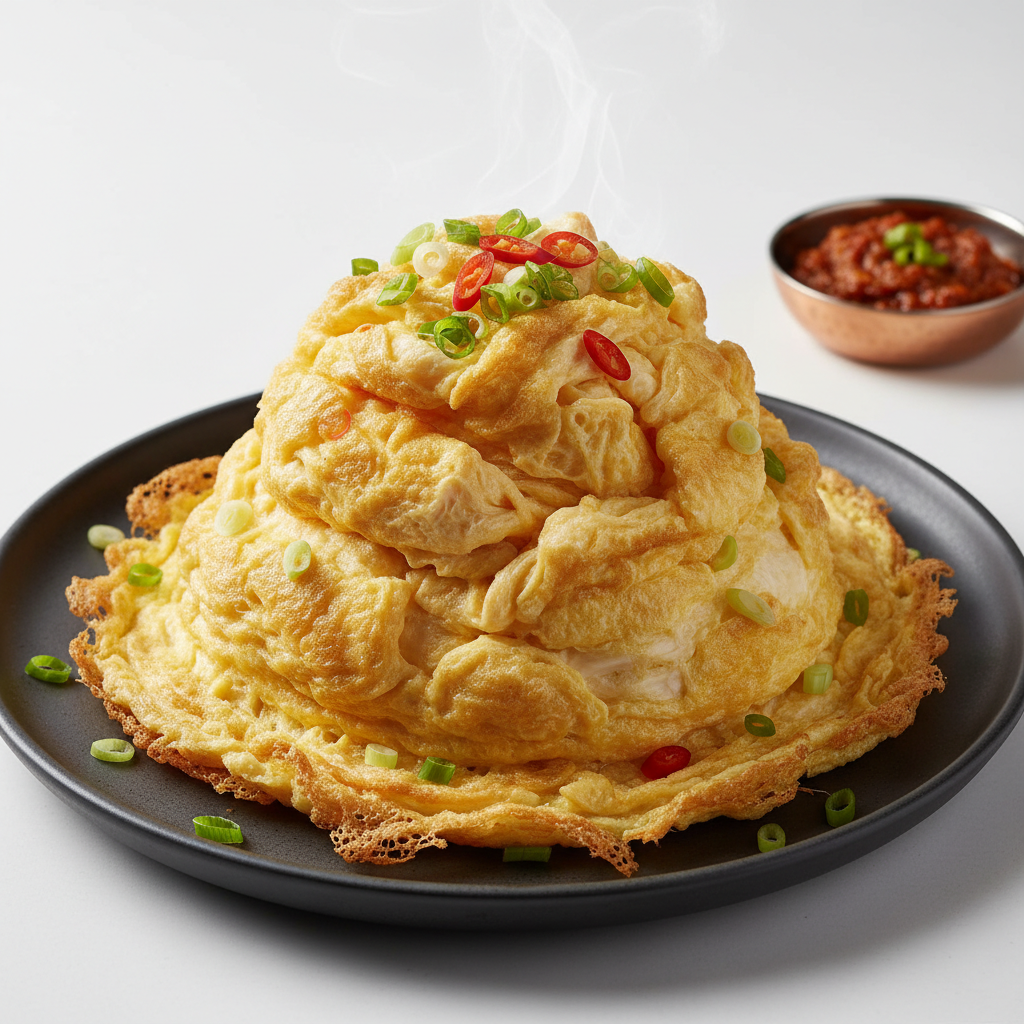Bayangkan mahakarya kuliner berupa telur dadar yang menjulang tinggi dengan tekstur luar yang luar biasa renyah dan berenda keemasan, namun menyimpan kelembutan tiada tara di bagian dalamnya. Setiap gigitan menghadirkan harmoni antara gurihnya telur pilihan yang diolah dengan teknik presisi, dipadukan dengan kesegaran daun bawang serta sentuhan pedas dari irisan cabai merah yang menggoda. Disajikan di atas piring keramik charcoal yang elegan, hidangan ini bukan sekadar telur biasa, melainkan perpaduan estetika dan rasa yang akan memanjakan lidah Anda sejak aroma uap hangatnya menyentuh indra penciuman.